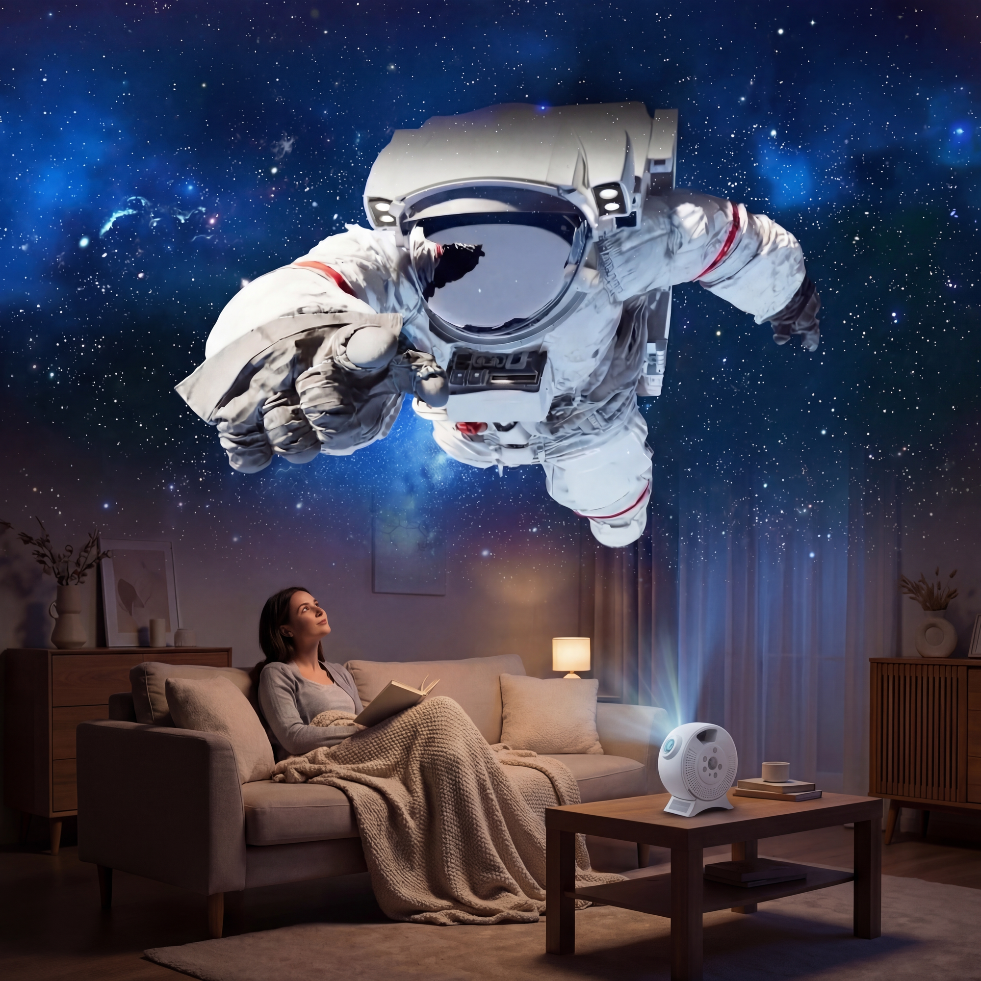 • It projects vivid HD scenes across your wall or ceiling — transforming any room into an immersive environment. Choose from 60 dynamic scenes including space, nature, ocean, forests, and seasonal celebrations.